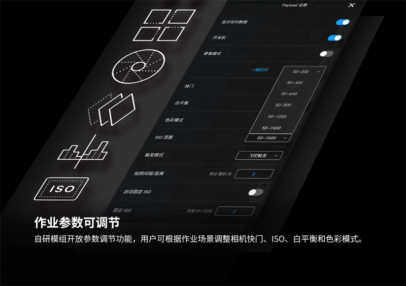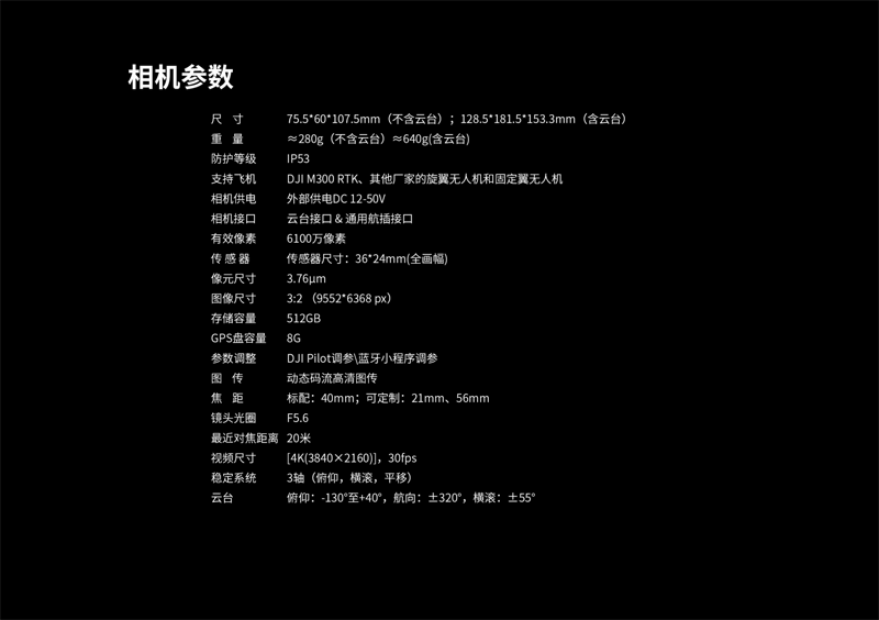 優勢 6100萬有效像素 | 機身重量僅280克 | 50萬次壽命鏡間快門 | 作業參數可調節 | 可上置云臺使用 | 標配J30J 21P接口 | 支持實時建圖/建模