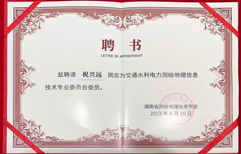 茲聘請 祝興遠同志 為交通水利電力測繪地理信息技術專業委員會委員,在此表示熱烈祝賀。