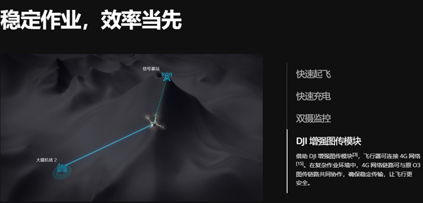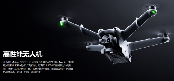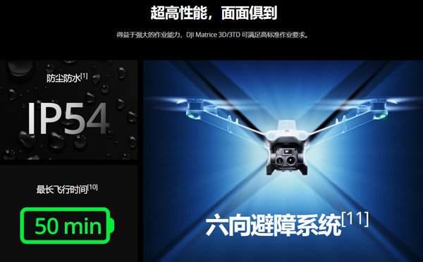 在無風環(huán)境下,DJI Matrice 3D 系列無人機以 54 公里/小時的速度勻速飛行于 20 米海拔高度至剩余 0% 電量時測得此數據。在不同的外部環(huán)境、使用方式、固件版本下,結果或有不同程度的差異,請以實際體驗為準。