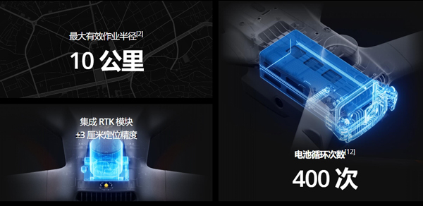 在環(huán)境溫度約 25℃、安全電量為 25%、環(huán)境風速約 4 米/秒、往返速度約 15 米/秒、懸停作業(yè) 10 分鐘等條件下測得此數據。在不同的外部環(huán)境、使用方式、固件版本下,結果或有不同程度的差異,請以實際體驗為準。